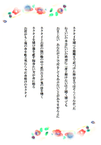 納得して、土方は静かに肩を落とした。確かに、女が自分の首にネクタイを締める必要などない。やり方を知らなくたって無理のないことだ。